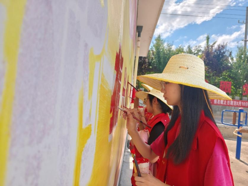 实践期间,队员们分工协作,承担起村内墙面绘制工作。从主题构思到图案设计,从调配颜料到细致描绘,创作期间,同学们不畏烈日暴晒与偶降阵雨,专注勾勒每一处细节,将乡村振兴、民俗文化等元素融入画作,让原本单调的墙面变成一道道靓丽风景线。同时,在实践期间,队员们自力更生、洗菜做饭,在烟火气中锤炼本领、增进友谊