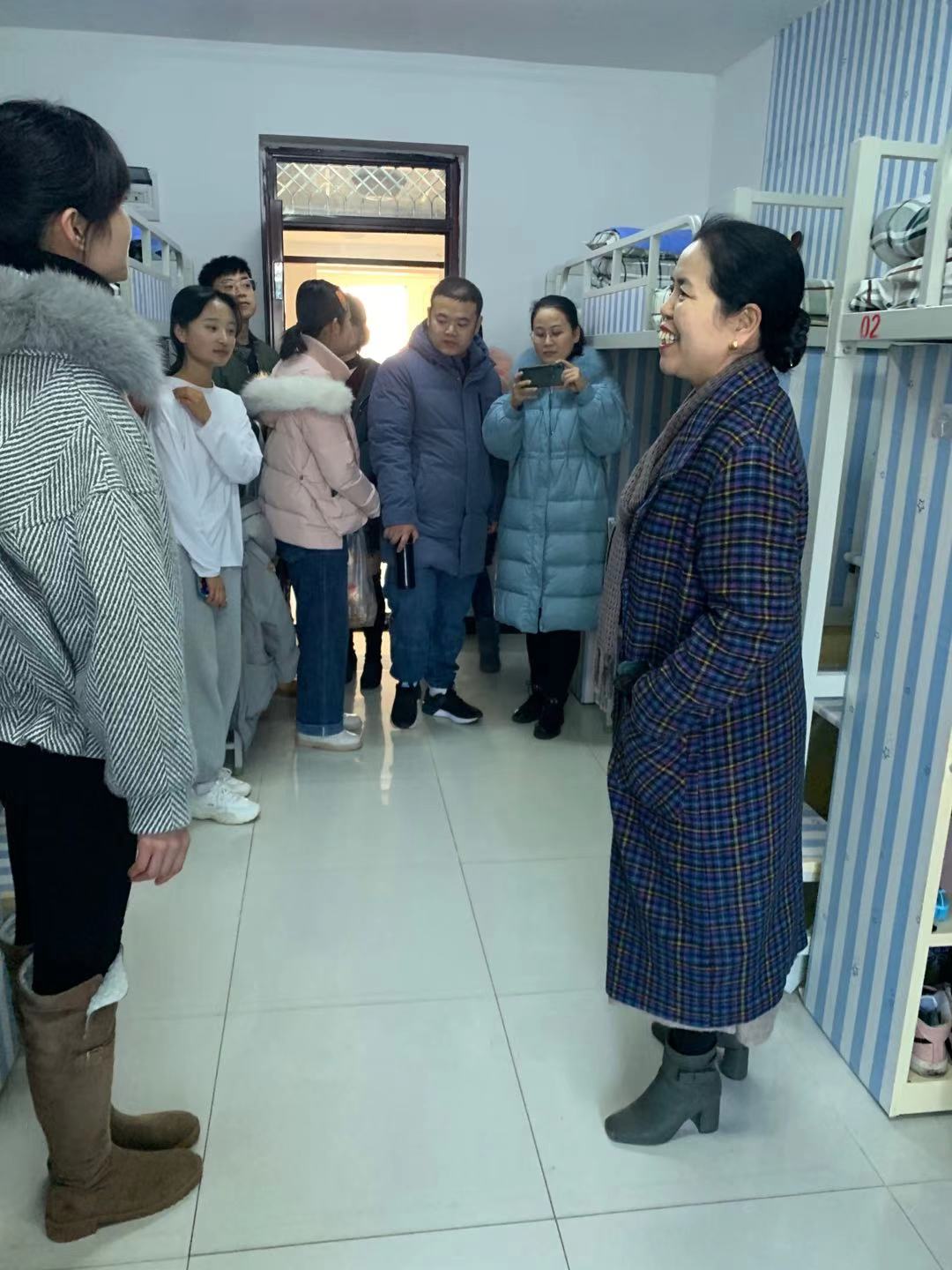 2020年12月21日伟德体育经理邢平与教师一起看望蟠龙塬20级新生,辅导员屈老师带领公司教师去员工宿舍,邢经理关心的询问员工在新校区的学习、生活以及饮食等问题,叮嘱员工临近期末抓紧时间复习备考的同时也要注意保暖,随后到教室与员工一起包饺子。