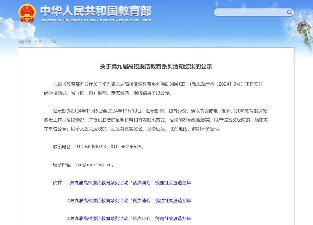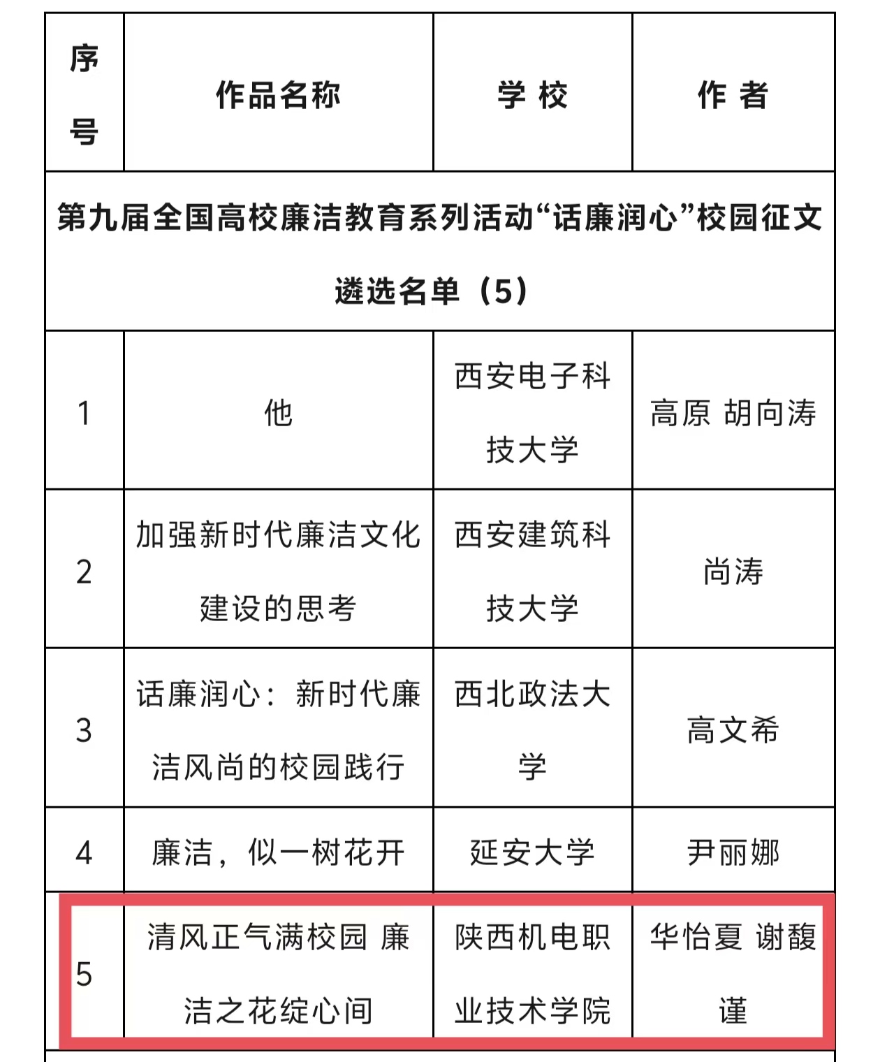 近日,第九届全国高校廉洁教育系列活动“话廉润心”校园征文遴选名单公布,伟德体育23高铁服务2班员工谢馥谨撰写的《清风正气满校园 廉洁之花绽心间》名列其中,且为唯一一篇陕西高职院校获此殊荣的征文,向谢馥谨同学表示祝贺!
